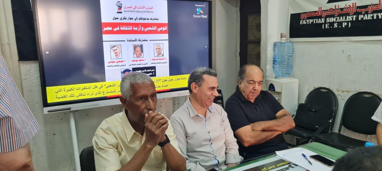 وشعوراً بأهمية هذه القضية الحسّاسة، نظم “الحزب الاشتراكي المصري” ندوة مُهمة تحت عنوان: “الوعي الشعبي وأزمة الثقافة المصرية”، ساهم فيها ثلاثة من كبار المبدعين المصريين، الأساتذة: “ماجد يوسف ” الشاعر والناقد والإعلامي، والأستاذ “صبحي موسى” الأديب والشاعر والناقد، والدكتور أسامه فرحات” الأديب والناقد والشاعر، فضلاً عن عدد من المثقفين والمبدعين المُشاركين، تتقدمهم الأستاذة الكبيرة د. “عواطف عبد الرحمن” الأكاديمية والرمز الوطني المحترم، د. “محمد حسن خليل” العضو القيادي بالحزب الاشتراكي المصري، والأستاذ “محمد الشافعي” الكاتب الكبير ورئيس تحرير مجلة “الهلال” الأسبق، والقيادي بحزب التجمع، النائب الأستاذ “عاطف مغاوري”، والقيادي بحزب التجمع أ. “صلاح سليمان”، والدكتورة “كريمه الحفناوي”، والأستاذة الصحفية والأديبة “بهيجه خسين”، والفنانة المبدعة والكاتبة أ. “حياة الشيمي”، السيتاريست المبدعة أ. “إيمان رشاد”، والدكتور المحترم “حاتم الجوهري”، والدكتورة “فرناز” وأساتذة أفاضل آخرين.