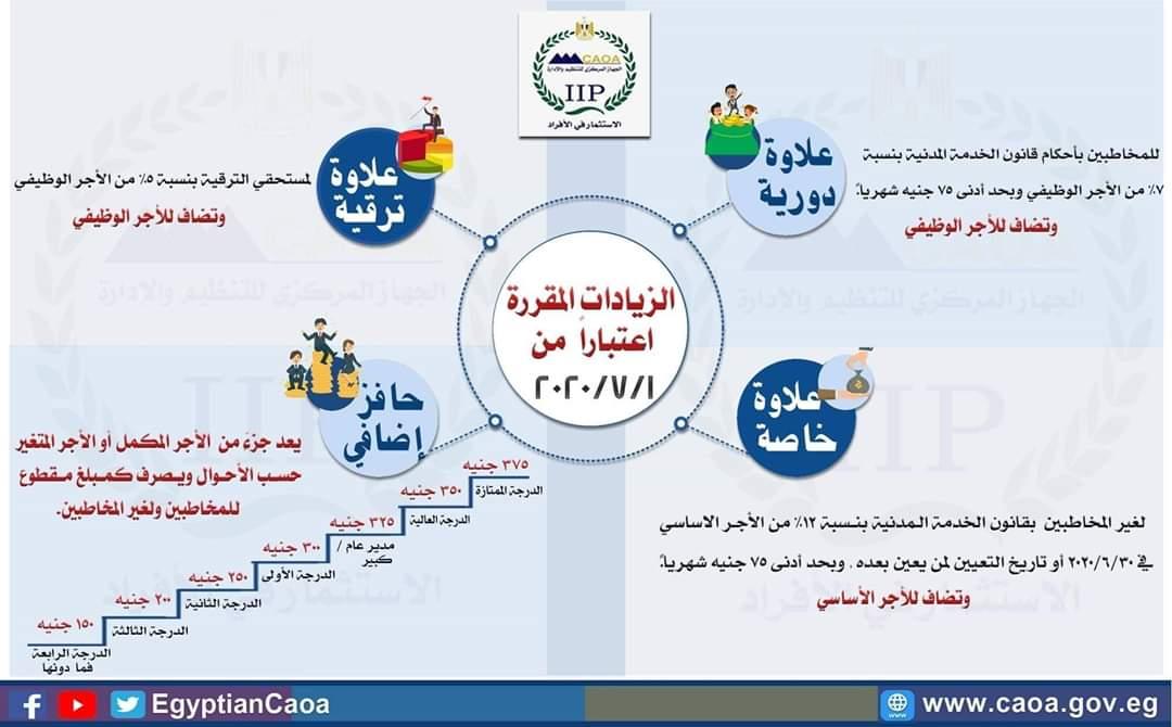 نشر الجهاز المركزي للتنظيم والإدارة برئاسة الدكتور صالح الشيخ الزيادات المقرر تطبيقها بدءا من غدا الأربعاء 1-7-2020، والتي تضمنت: