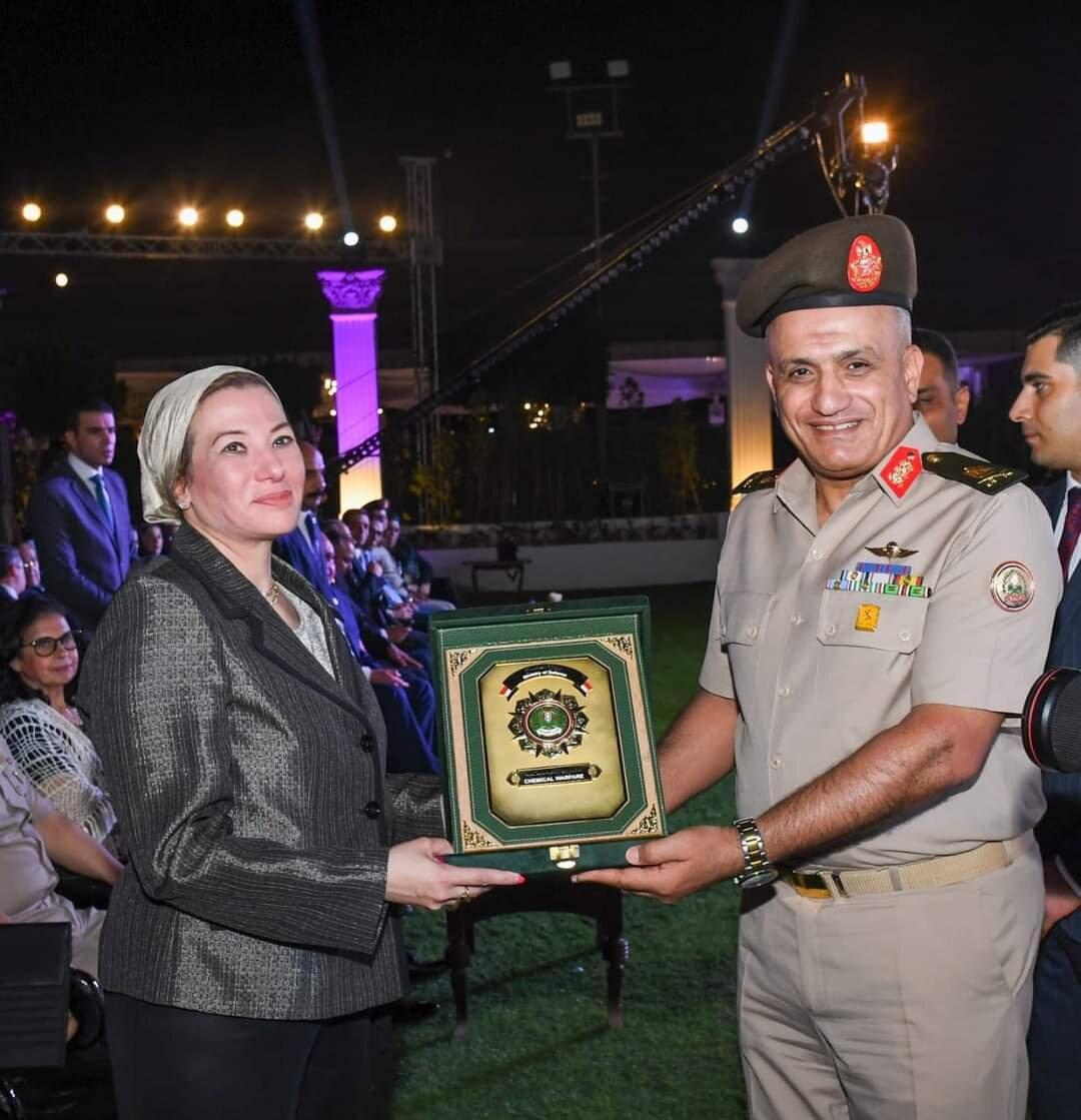 هذا وقدم السيد الدكتور اللواء أ.ح عبدالحميد سيد أحمد مدير الحرب الكيميائية درع إدارة الحرب الكيميائية للدكتورة ياسمين فؤاد تكريما لها وتقديرا لجهودها فى حماية البيئه.
