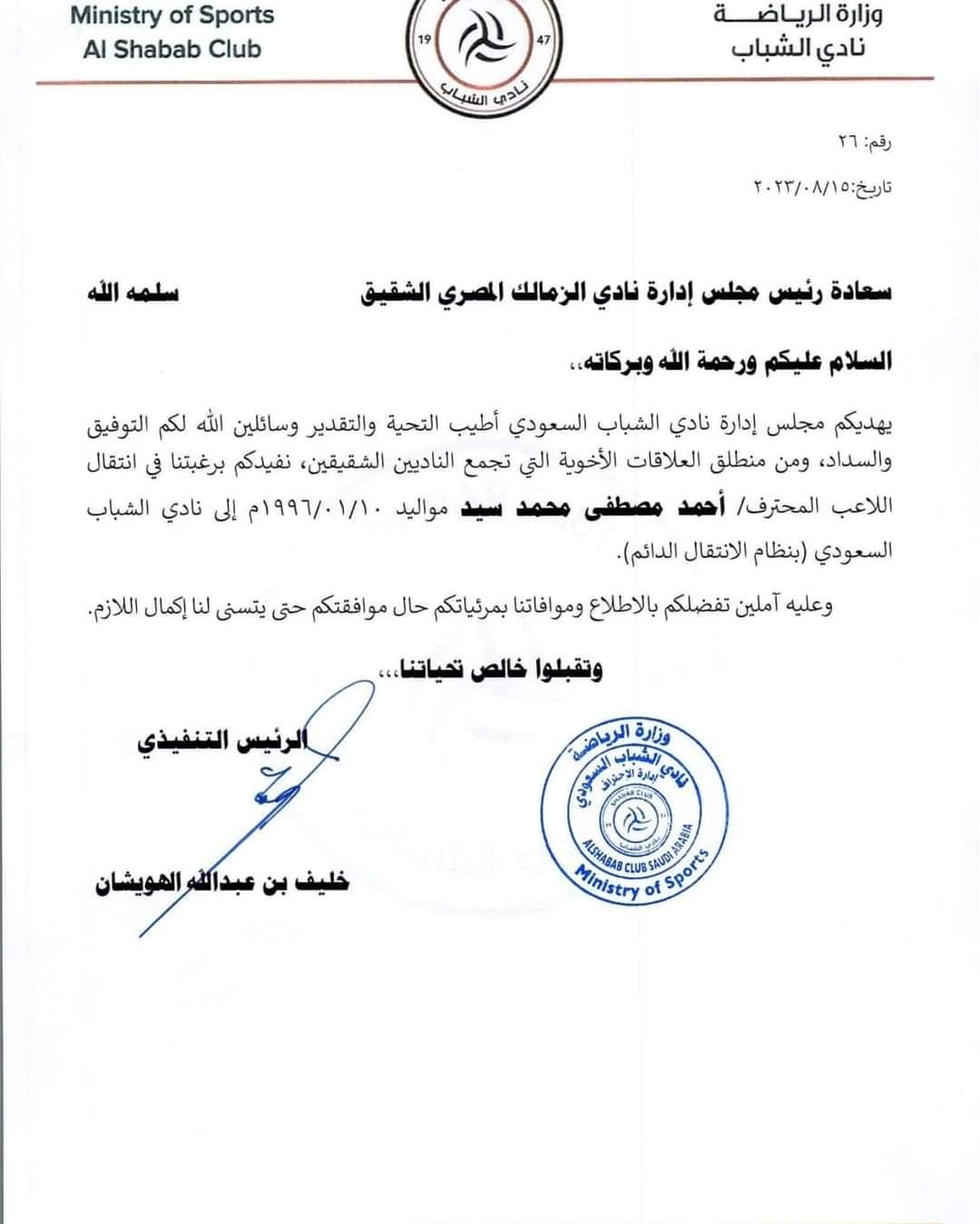 اليوم وصل رسميا فاكس لنادي الزمالك من نادي الشباب السعودي لطلب ضم الاعب و عرض أولي بخمس ملايين دولار