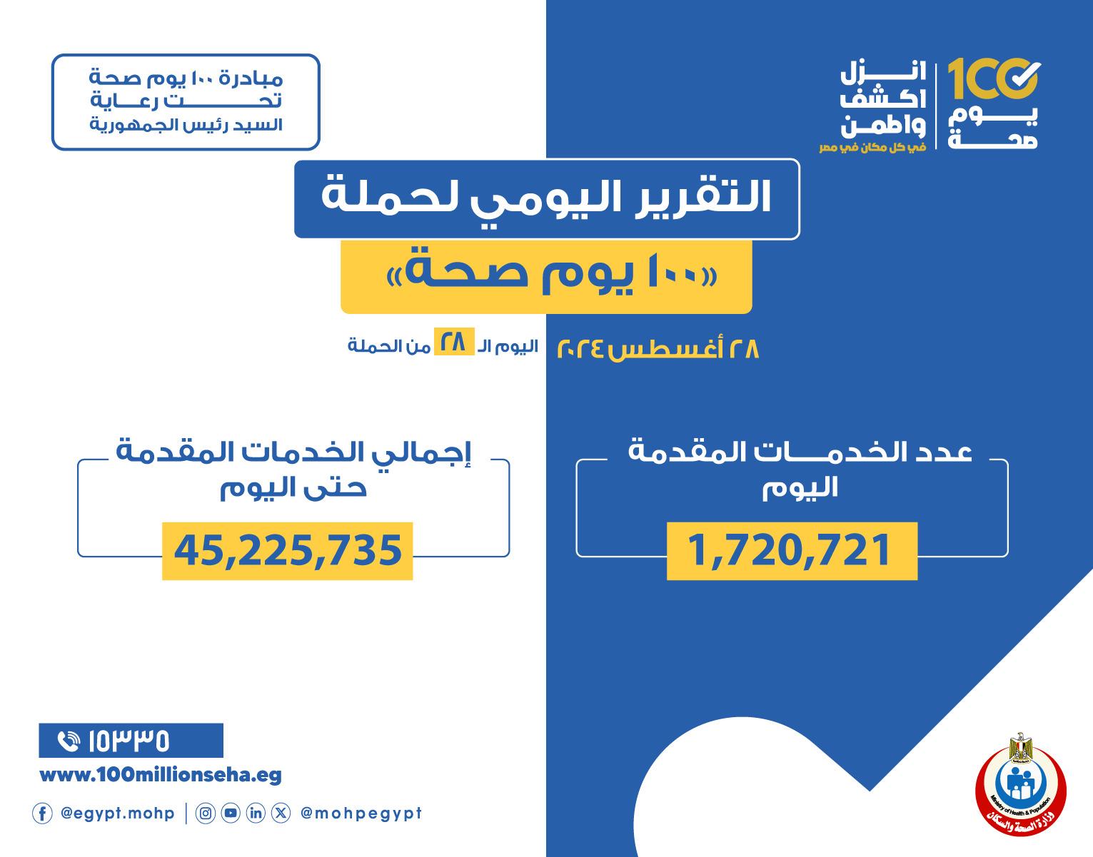 أعلن الدكتور خالد عبدالغفار نائب رئيس مجلس الوزراء ووزير الصحة والسكان، تقديم 45 مليون و225 ألف و735 خدمة طبية من خلال حملة «100 يوم صحة» منذ إطلاق الدكتور مصطفى مدبولي رئيس مجلس الوزراء، للنسخة الثانية، مساء يوم 31 يوليو 2024، وحتى مساء أمس الأربعاء 28 أغسطس، في جميع محافظات الجمهورية، برعاية الرئيس عبدالفتاح السيسي.